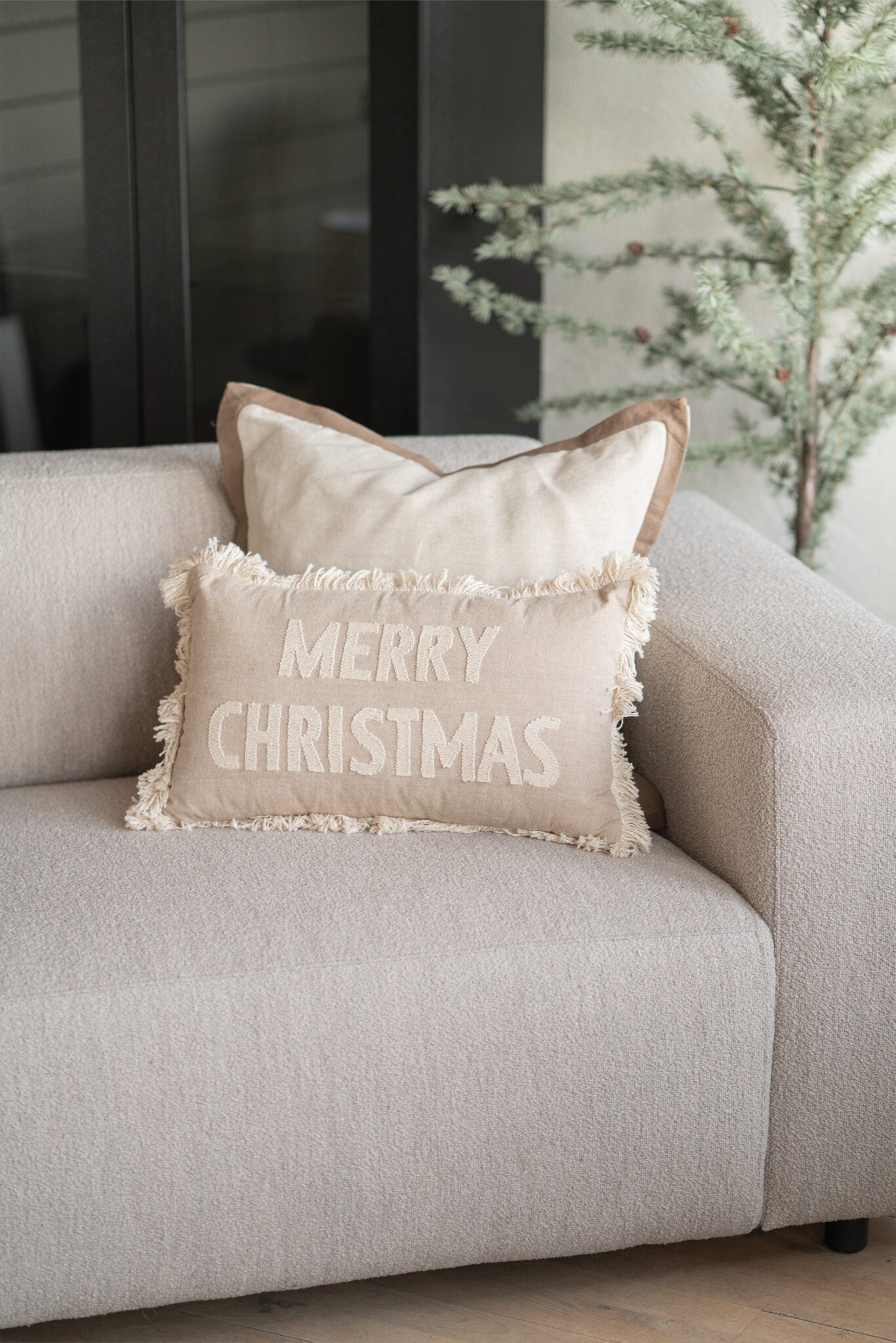 Merry Christmas Kissenbezug aus Baumwollleinen mit Fransen.